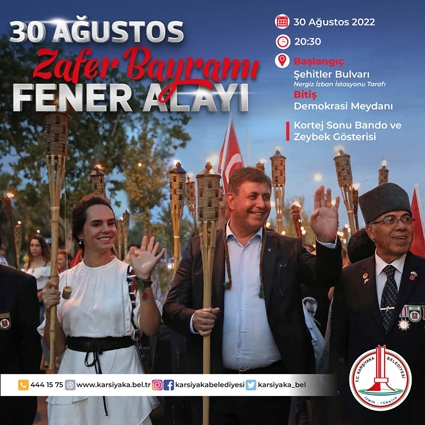 Cumhuriyetimizin ilanının 99. yılını Karşıyaka’mızda her yıl aynı coşkuyla düzenlediğimiz 30 Ağustos Zafer Bayramı fener alayı ile kutlayacağız. Şehitler Bulvarı Nergiz İZBAN İstasyonu yanından başlayacak fener alayını Demokrasi Meydanı’nda tamamlayacağız. Bayram coşkusunu paylaşmak üzere tüm yurttaşlarımızı fener alayına bekliyoruz.